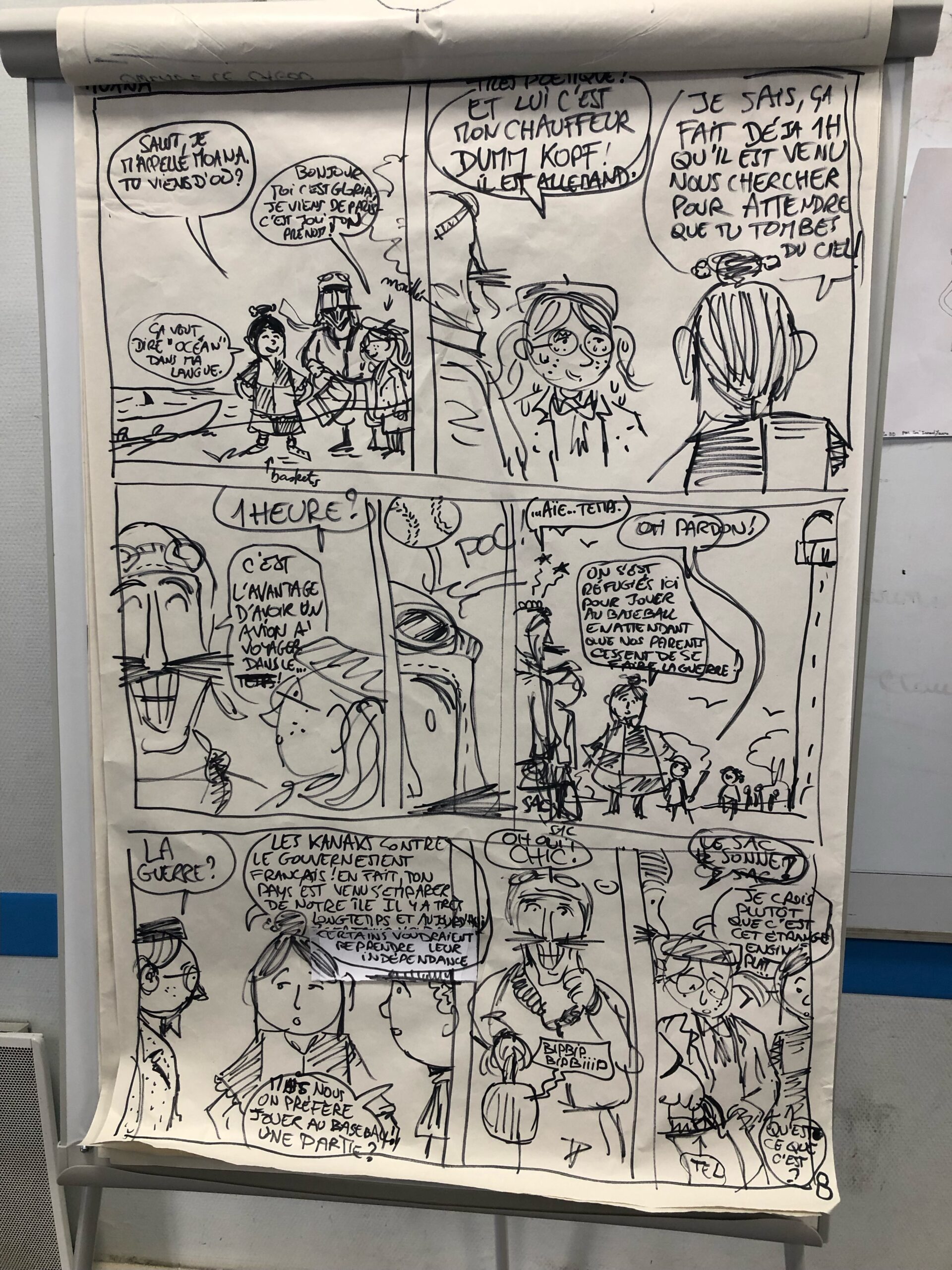 Zoé a fini la première page de l’orphelinat, Liam et Logan ont commencé à encrer leurs planches pendant que Matisse, le dialoguiste, s’exerce à dessiner des maisons ; tandis que Marc, l’autre adulte avec JC, travaille depuis la Martinique avant de rejoindre l’atelier en mars pour la dernière ligne droite.