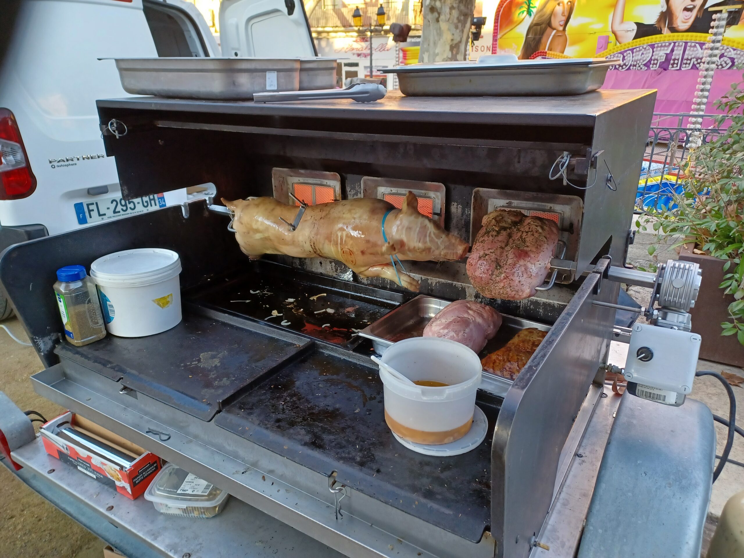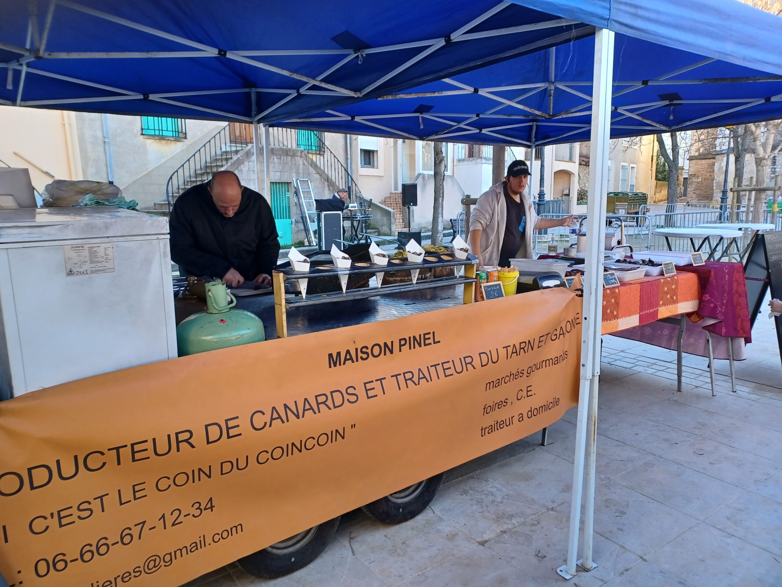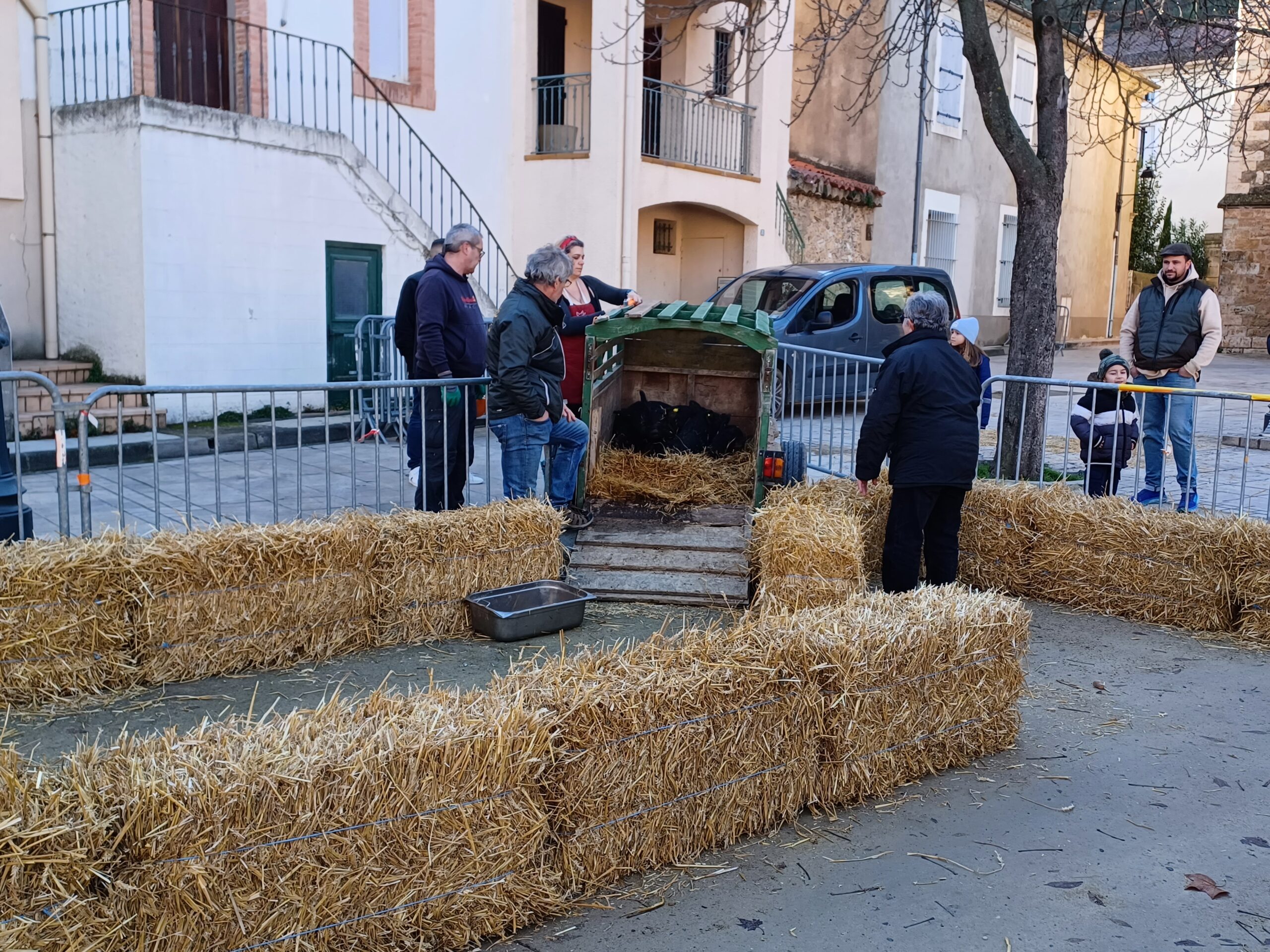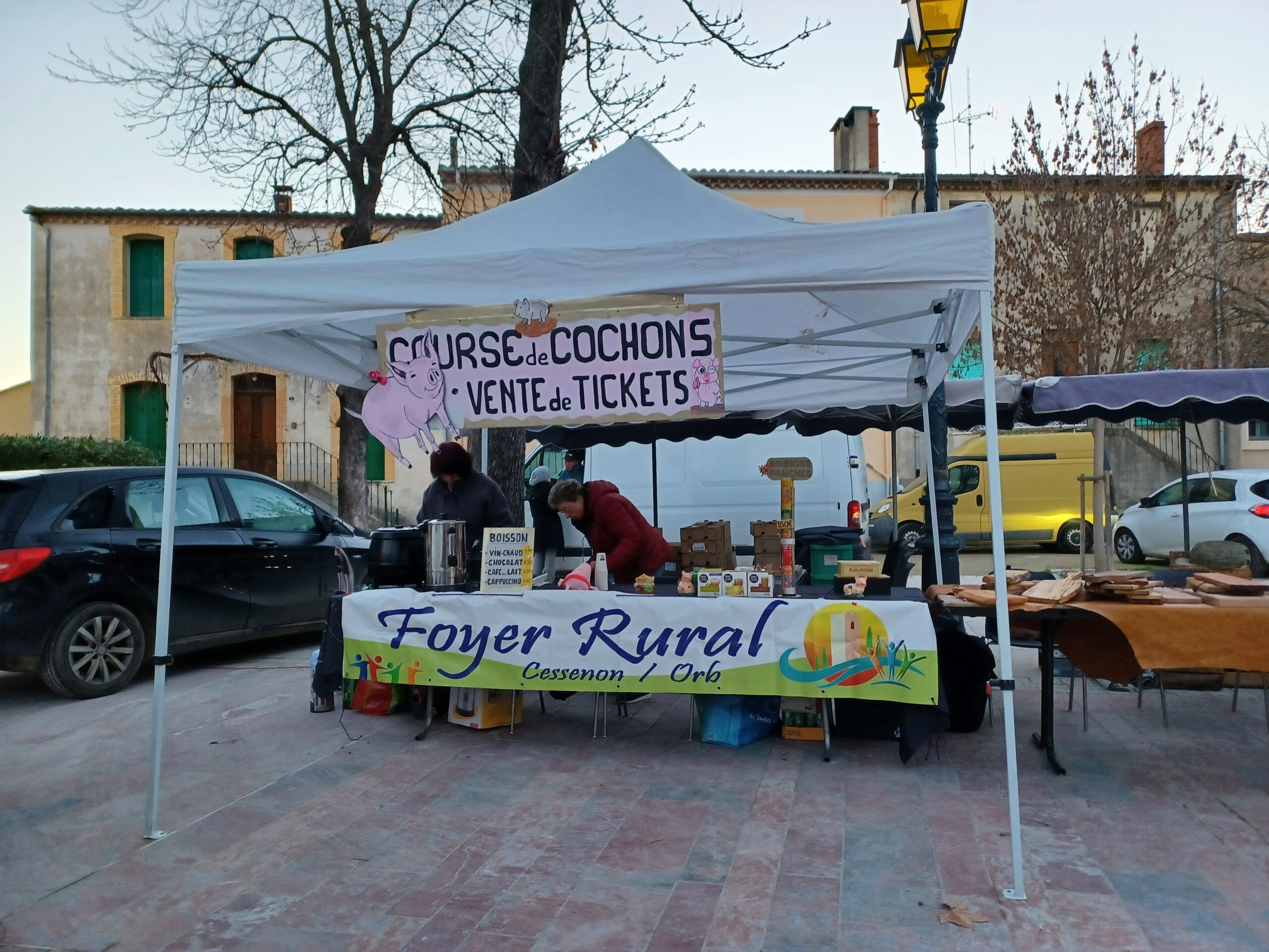 Pour le Foyer Rural c’est un travail des bénévoles sur quelques mois qui permet d’organiser sa contribution à la fête : la course des cochons, depuis la recherche des ballots de paille, l’achat des cochons, la confection et la vente des billets de la course ; et le marché des producteurs et artisans depuis la publicité pour appeler aux inscriptions, l’attention portée à diversifier les produits uniquement artisanaux et de qualité, jusqu’à l’agencement et l’installation des étals au petit matin le jour J. Cette année nous avons également tenu un stand de boissons et proposé un excellent vin chaud confectionné la veille.
