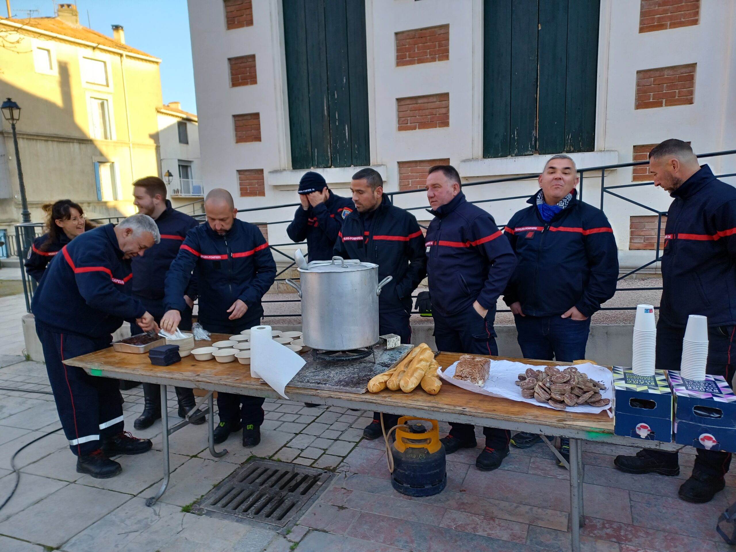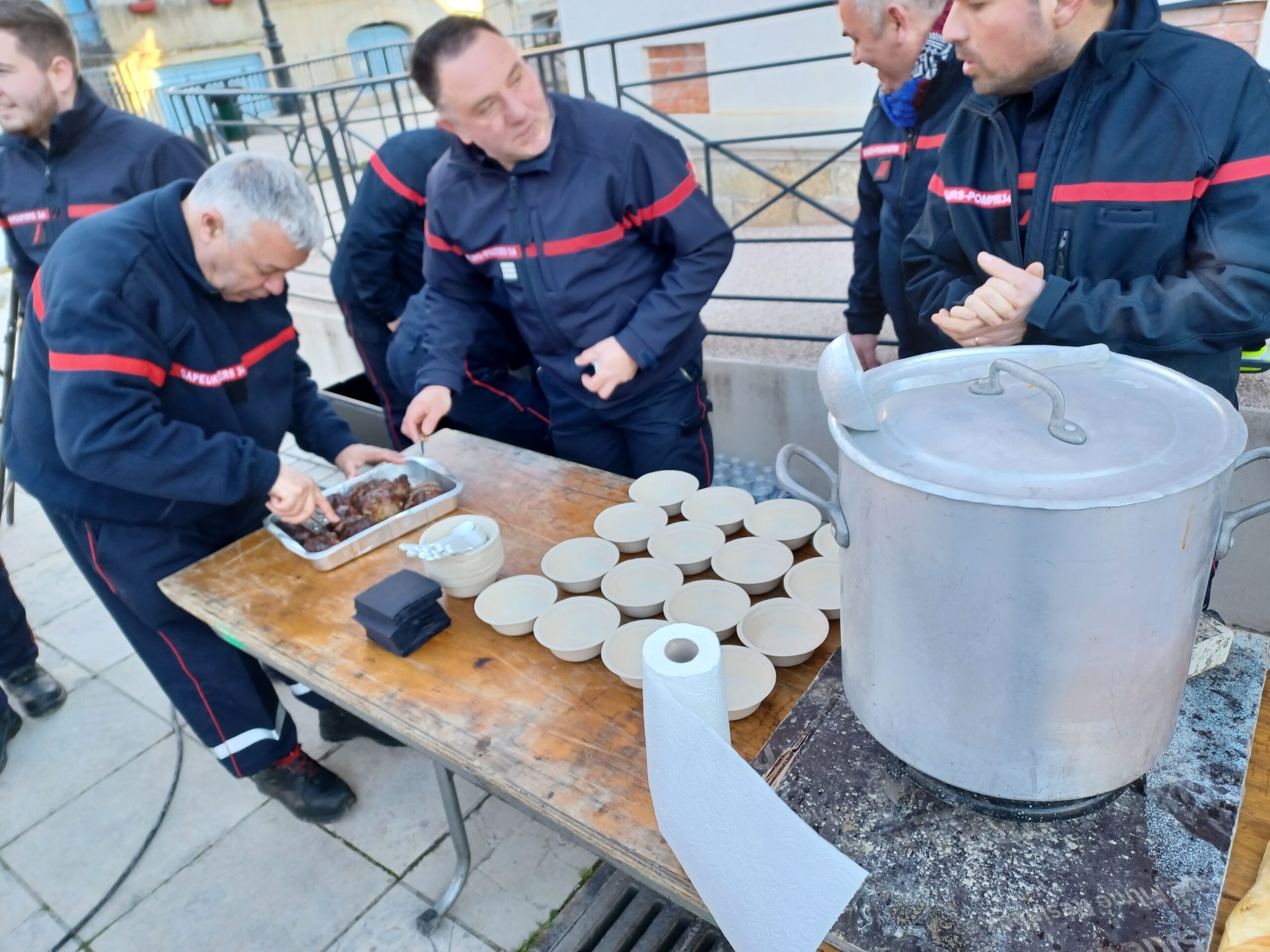 Les pompiers assurent comme chaque année le service du plat de tripes offert par la mairie et cuisiné par notre boucherie Maison Calas